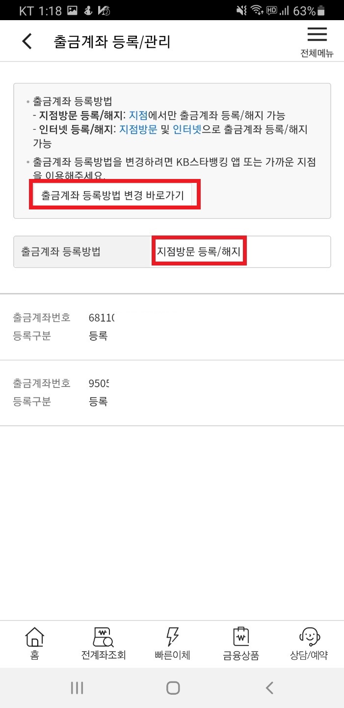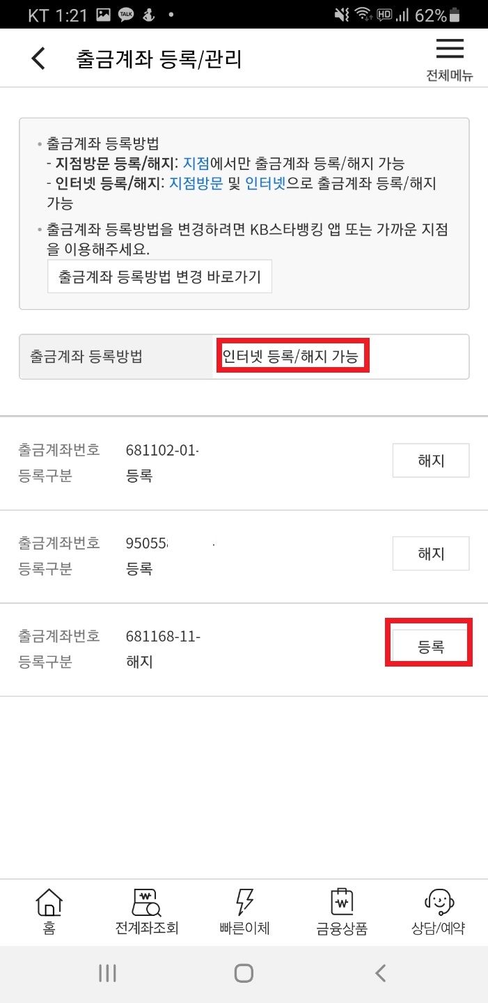 관리를 지점 방문으로 되어있어서 다시 인터넷으로도 할 수 있게 바꿔줘야 합니다.
