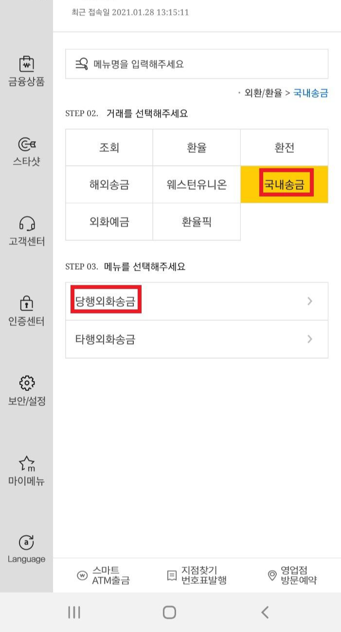 오른쪽 사진처럼 전체 메뉴에서 당행 외화송금으로 보내셔야 됩니다.