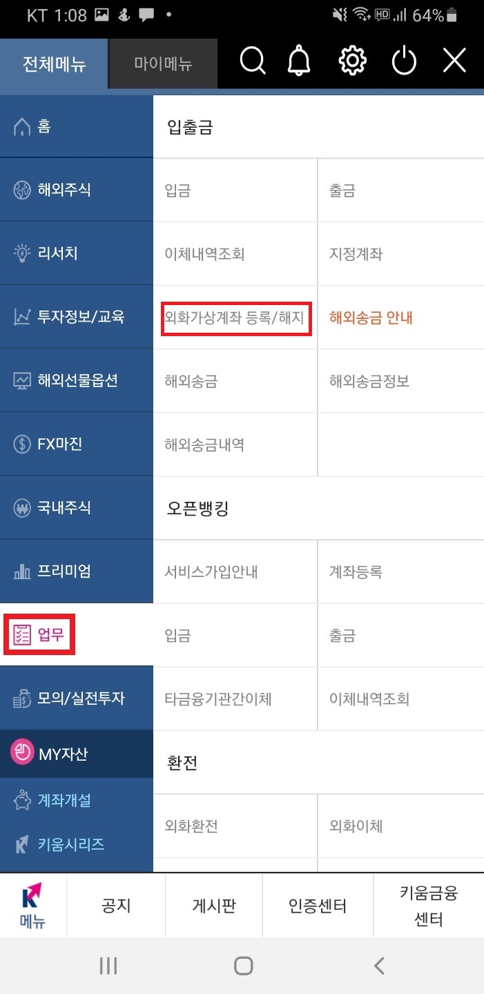 영웅문 s에 접속하시고 업무-외화 가상계좌 등록/해지로 들어가서