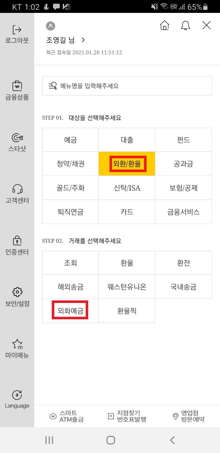 kb스타뱅킹에서 외화예금으로 들어가 왼쪽 외화 보통예금으로 만듭니다.