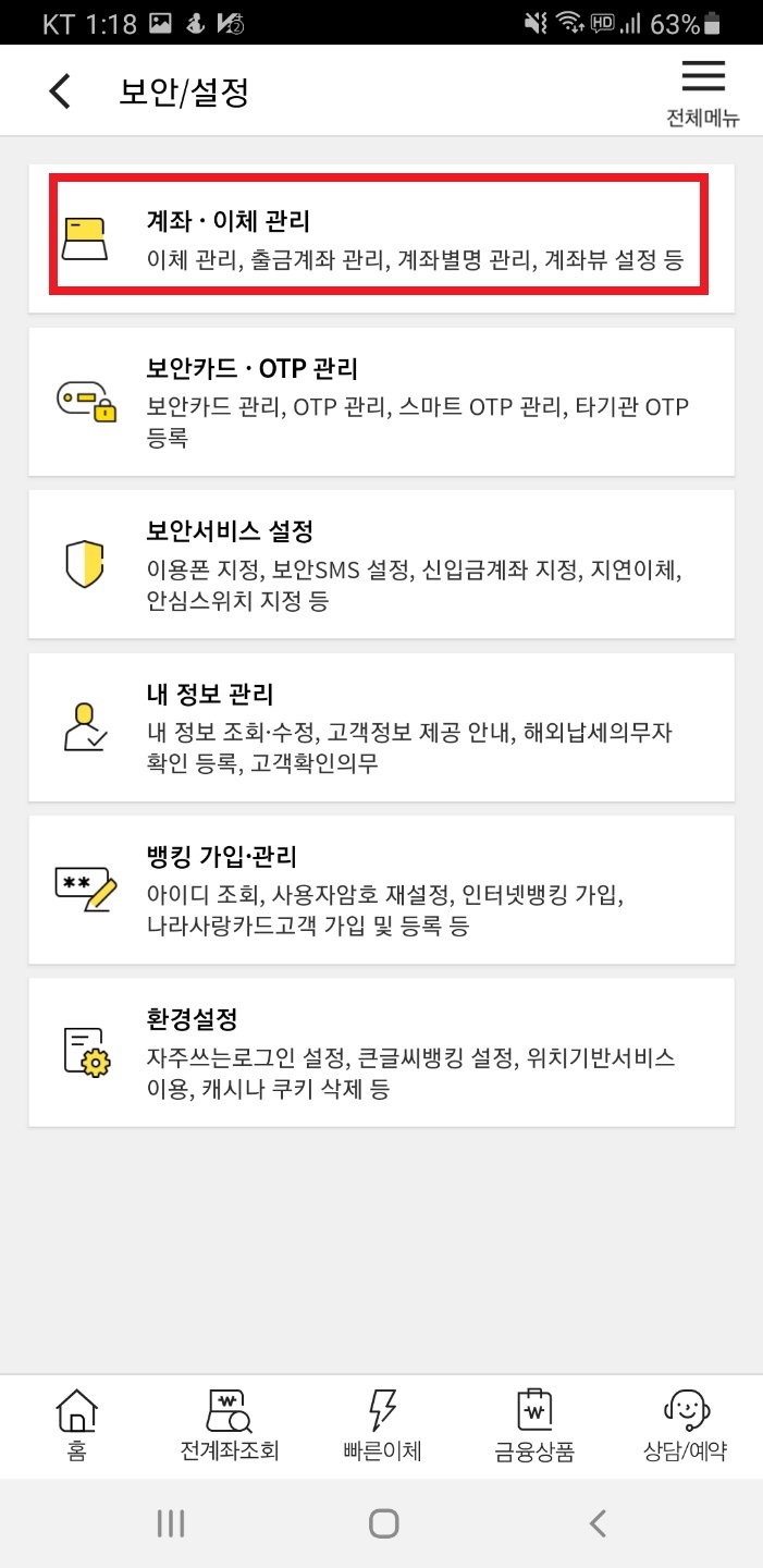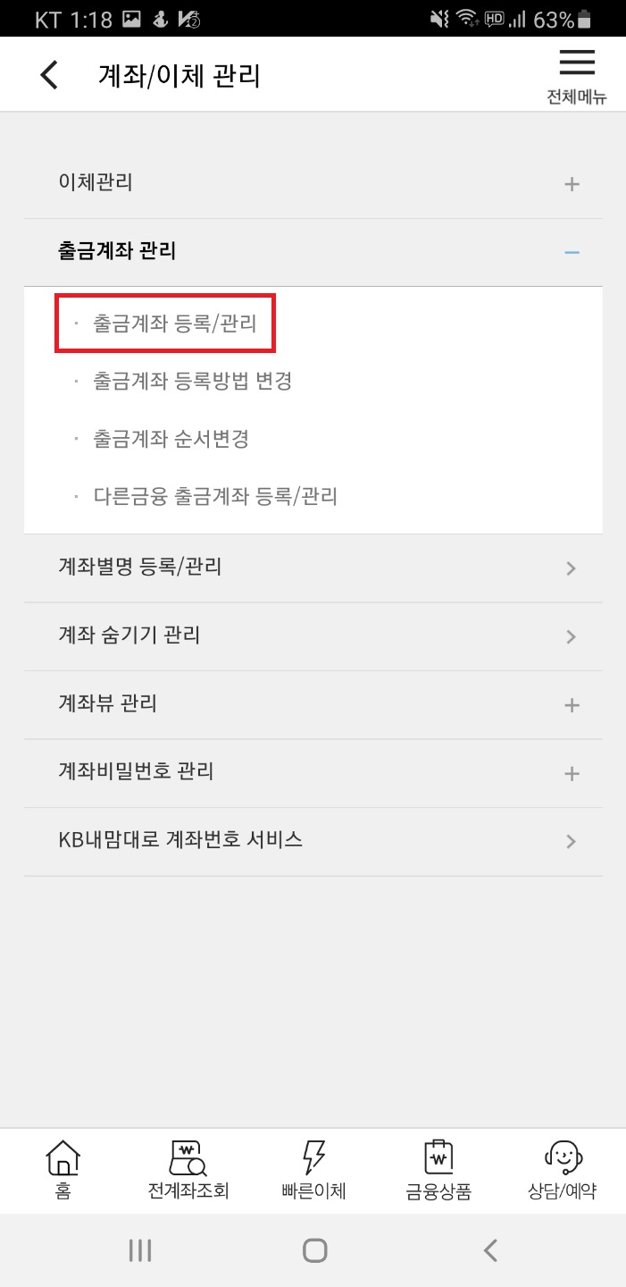 전체 메뉴에 보안/설정에서 계좌-이체 관리로 들어가 출금계좌 등록/관리에서 등록을 해줍니다.