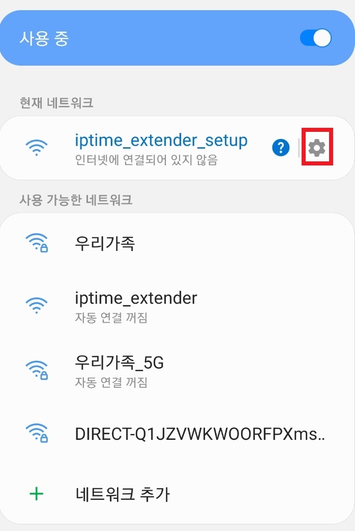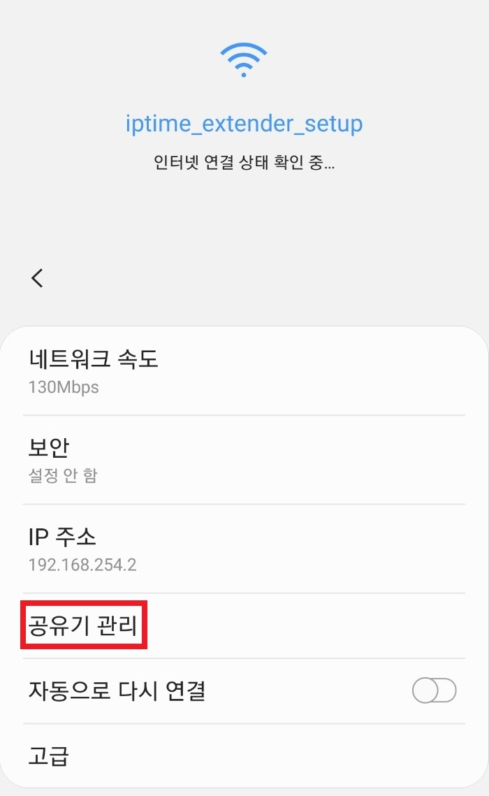 2. iptime_extender_setup이라는 와이파이가 보이는데 연결을 해줍니다.
