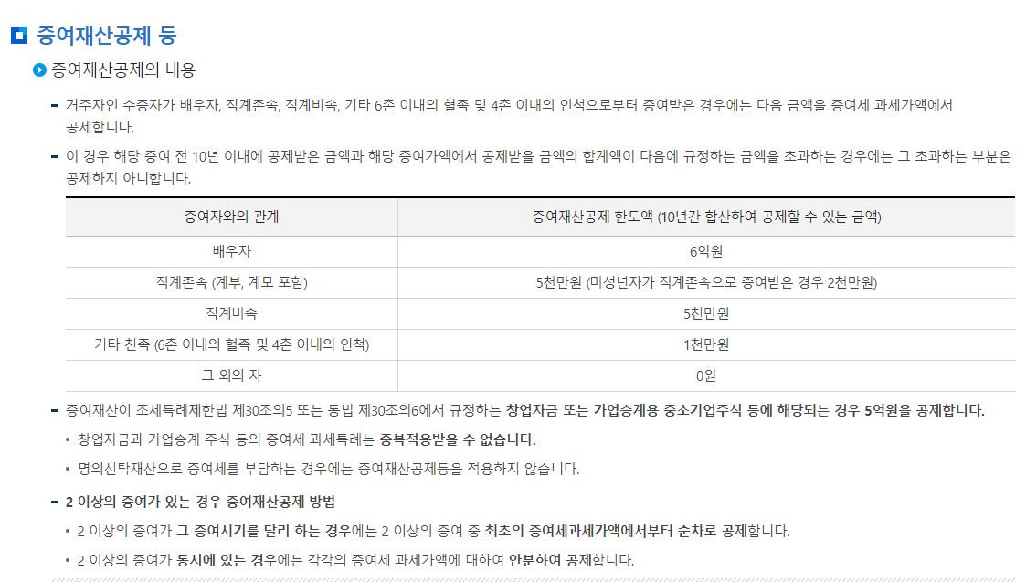 배우자의 경우 10년 동안 6억원, 직계존속의 경우 5천만원, 기타 친족의 경우 1천만원이 공제됩니다.