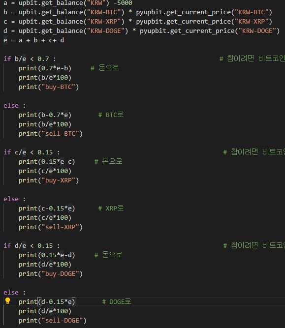 이럴 때 제 코드에서는 비트코인을 매도하고 더 많이 떨어진 XRP와 BTC를 매수하게 됩니다.