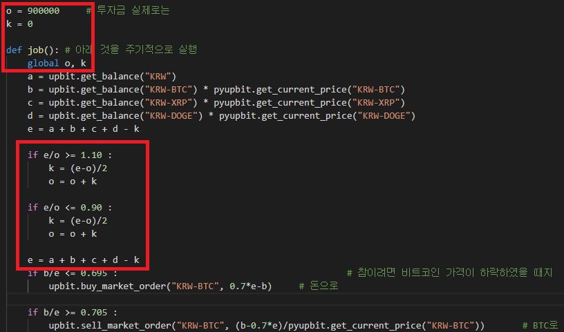 첫 번째 if는 만약에 110% 즉 10% 수익이 나면 기준금액을 102.5%로 만들고 5%는 현금으로 비축을 합니다.