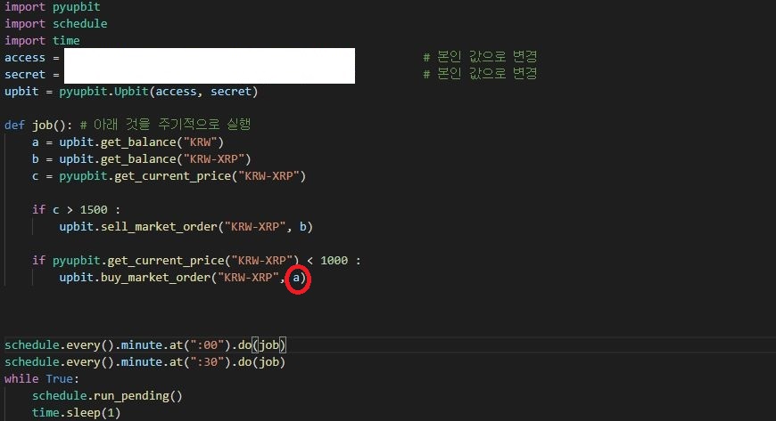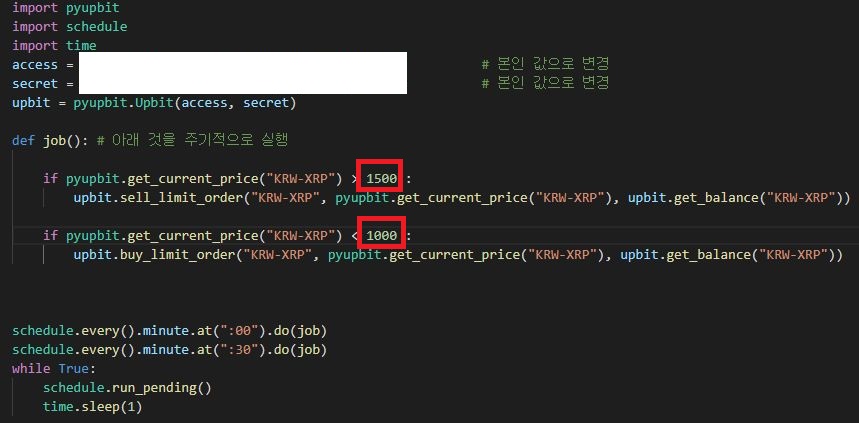 일단 If로 현재 리플 가격을 불러오고 이 리플의 가격이 1500원 이상일 때는 가지고 있는 리플을 모두 팔게 합니다.