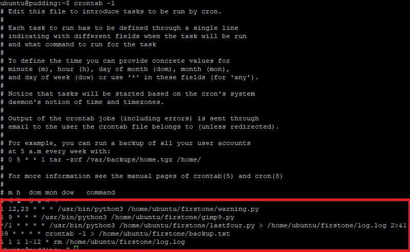 * * * * * /usr/bin/python3 /home/ubuntu/firstone/lastfour.py > /home/ubuntu/firstone/log.log 2>&1