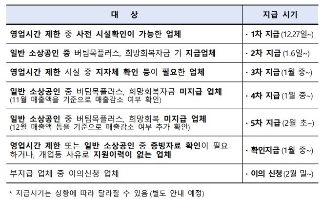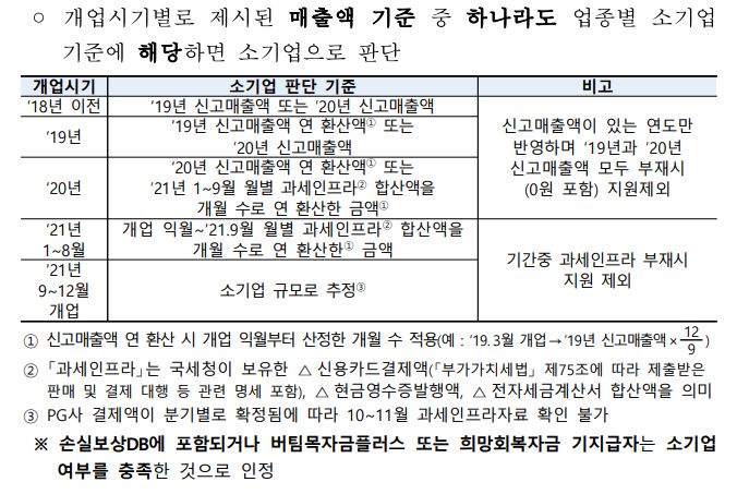 영업시간 제한으로 조치를 받는 소상공인*소기업 이나 영업시간 제한을 받지 않았으나, 매출이 감소한 것으로 인정되는 소상공인 및 소기업(버팀목 자금 플러스 , 희망회복자금을 지급받은 업체 및 매출 감소기준을 충족하는 사업체)