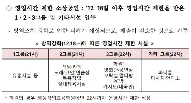 12월 18일 이후 영업시간 제한을 받은 1,2,3그룹 및 기타시설 일부