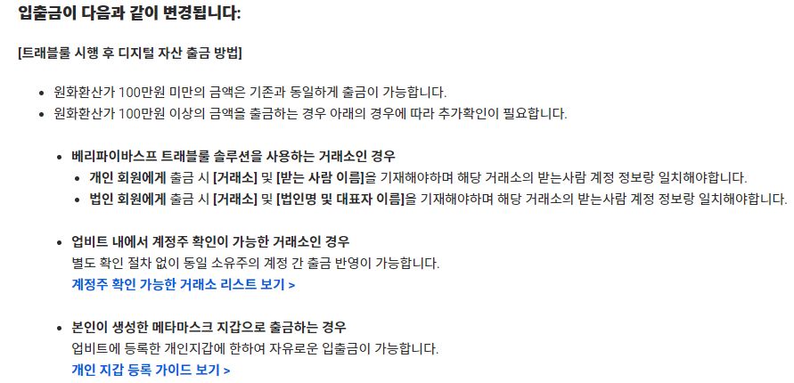 업비트의 경우 3월 25일 금요일부터 실행하였는데 간단히 말해 실명이 등록되어있지 않으면 거래소간 거래를 못하게 된다.