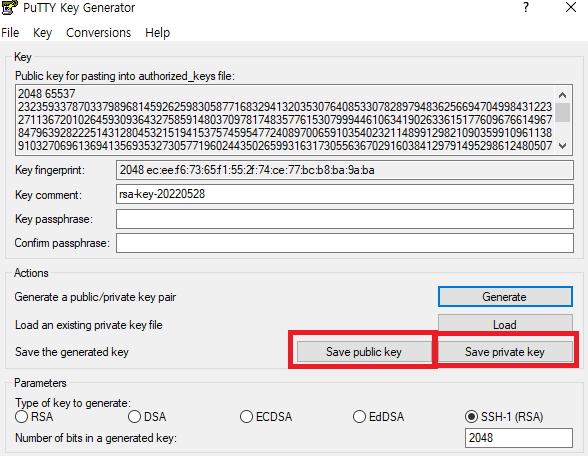 generate를 누르고 만들어주고 public key와 private키를 저장해 줍니다.
