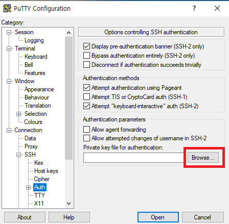그리고 SSH를 눌러서 auth에 들어가면 putty gen에서 만든 파일을 선택하면 됩니다.