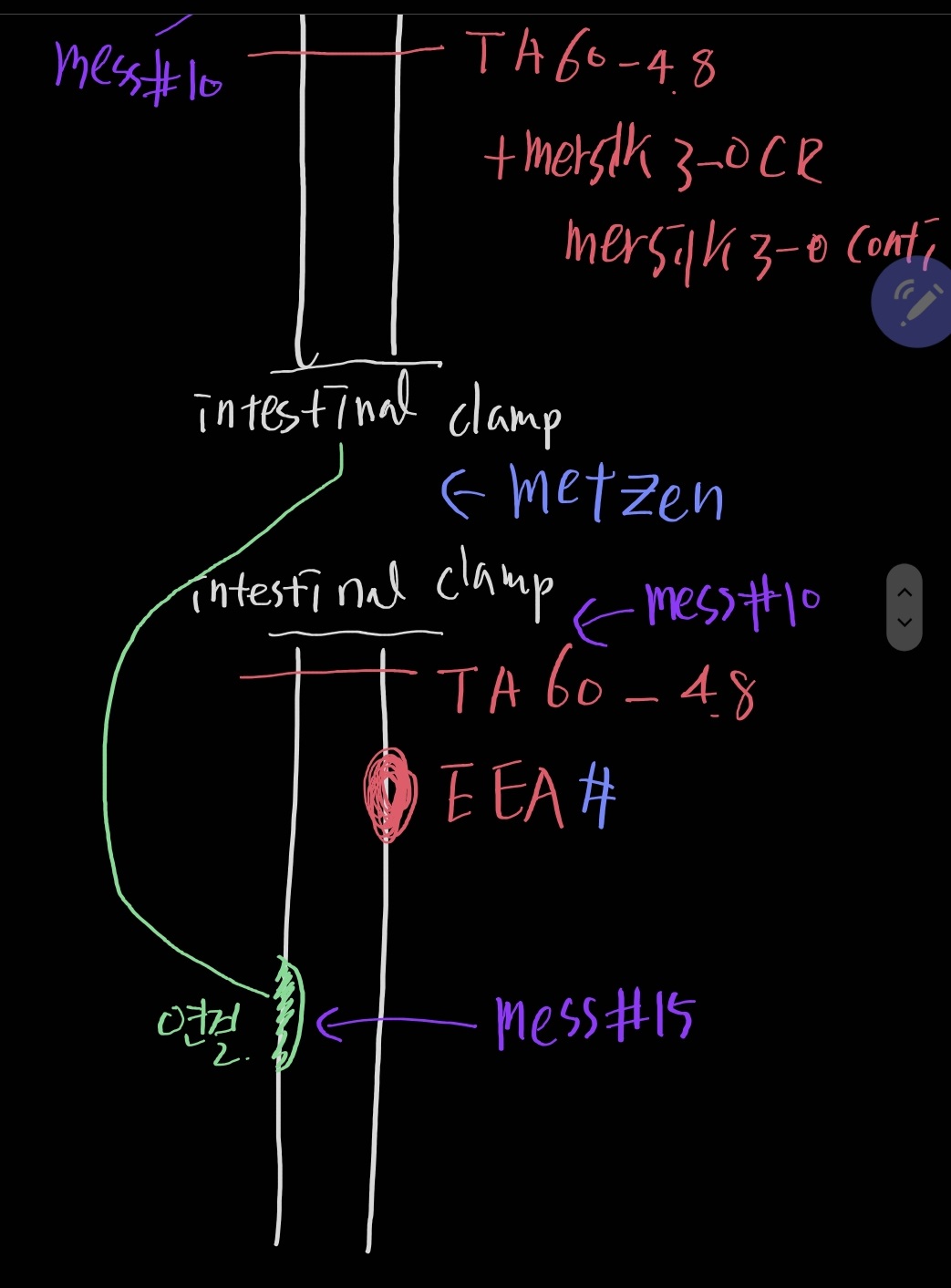 9) esophago-jejunostomy : (illeum 방향쪽)jejunum 잡았던 intestinal clamp 풀고 EEA(25)를 넣어 esophagus와 anastomosis 해준다. intestinal clamp 푼곳은 babcock 3ea로 잡고 TA로 stapler 처리후 mess#10로 잘라주고 mersilk 3-0 continuous 2ea 로 보강 suture 한다.