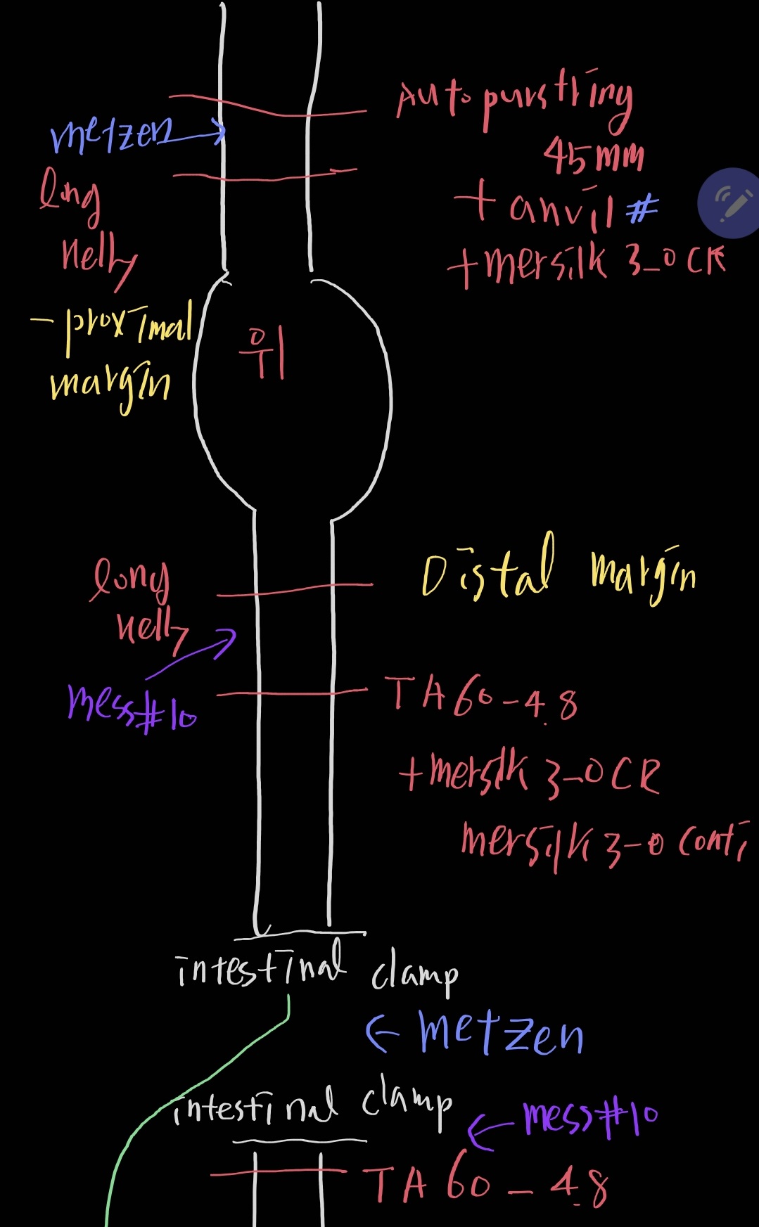 7) stomach resection : Auto purstring(45mm), long kelly로 Esophago-gastric junction 잡고 metzen으로 잘라낸 후 anvil 넣고 mersilk 3-0 CR로 보강 suture