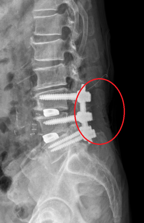 사진은 total laminectomy를 했다. 동그라미 안쪽에 아래를 보면 아래는 뼈가 없다.