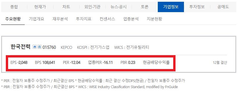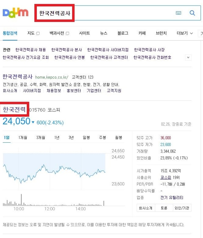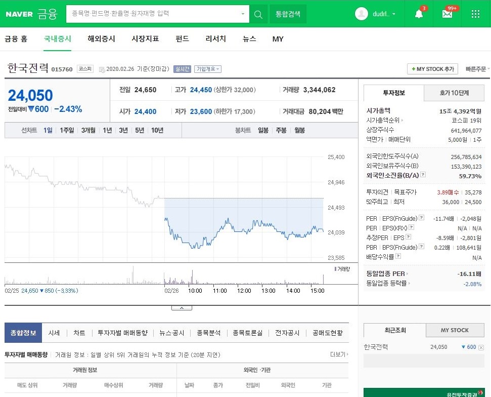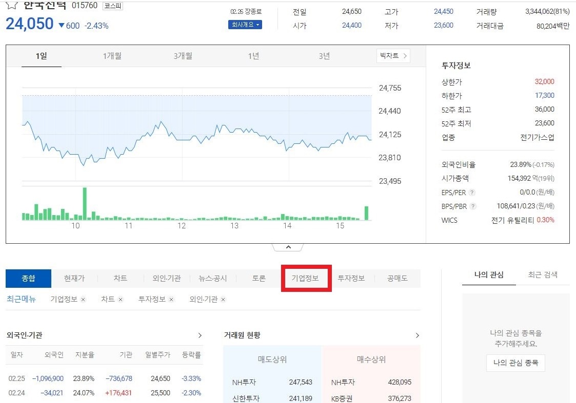 네이버의 경우 마찬가지로 한국전력 공사를 치고 증권정보에 들어가면