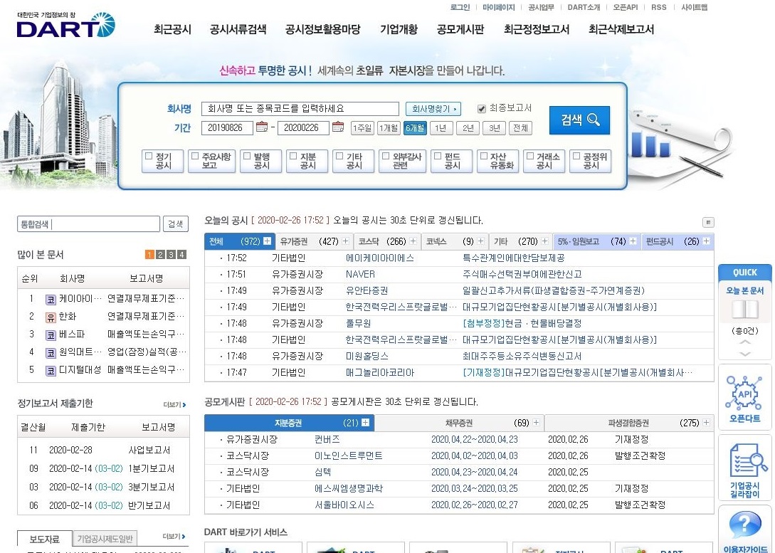 재무재표를 확인하기 위해서는 일단 전자공시 시스템을 들어갑니다. 혹은 영어로 DART라고 써도 됩니다.
