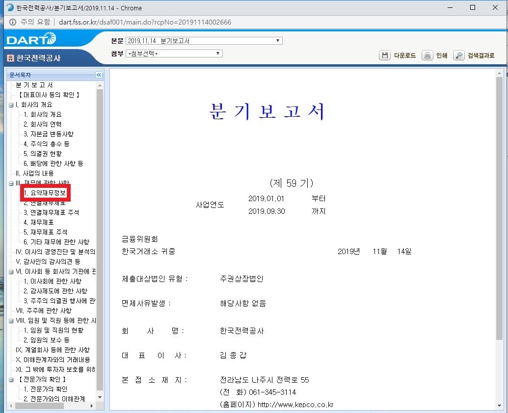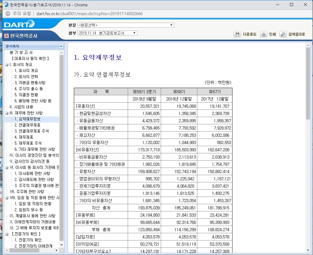 저는 한국전력주식을 조금 가지고 있기 때문에 한국전력공사의 지난 분기 레포트를 찾겠습니다.