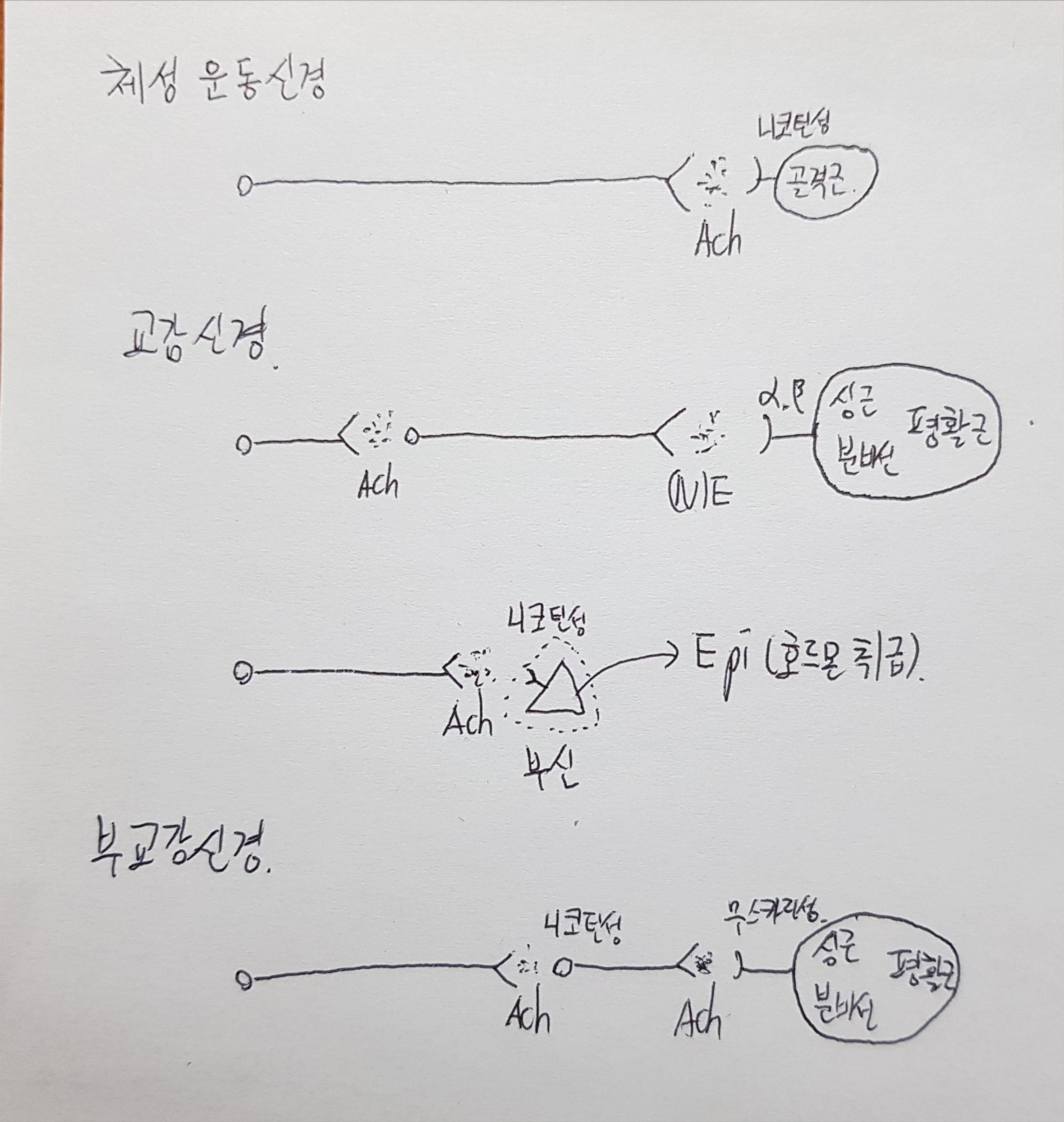중추신경계는 뇌와 척수, 말초신경계는 체성신경계와 자율신경계(+장신경계, 일반적으로는 생각을 잘 안하니끼 제외하면)로 나뉩니다.