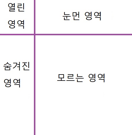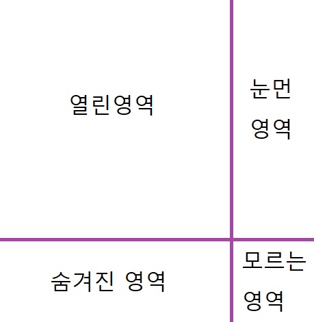첫 번째 사분면은 열린영역(open guadrant)으로 나도알고 다른사람도 모두 아는 부분입니다. 간단한 예를 들면 키, 몸무게, 성별, 직업등 남도 알 수 있는 것이고 열린 영역이 많을 수록 공감대 형성이 용이하고 상호작용을 활발하게 할 수 있다고 합니다.
